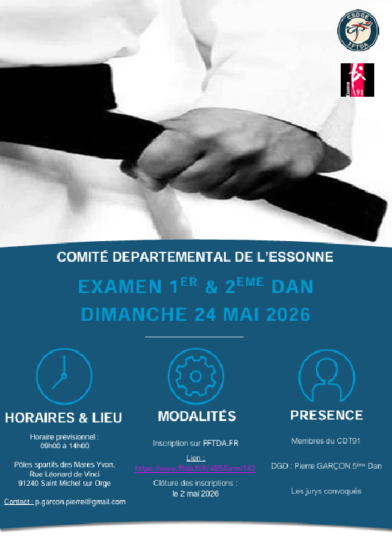 Le Comité Départemental de Taekwondo et Disciplines Associées de l’Essonne (CDT91) a le plaisir d’annoncer le deuxième Stage de préparation 1er & 2eme DAN de la saison